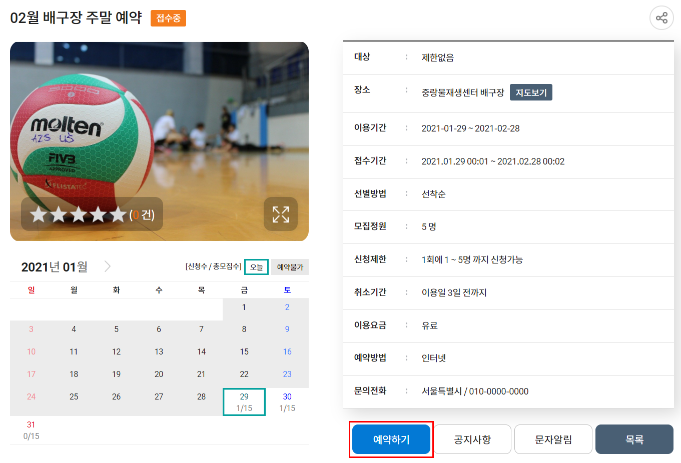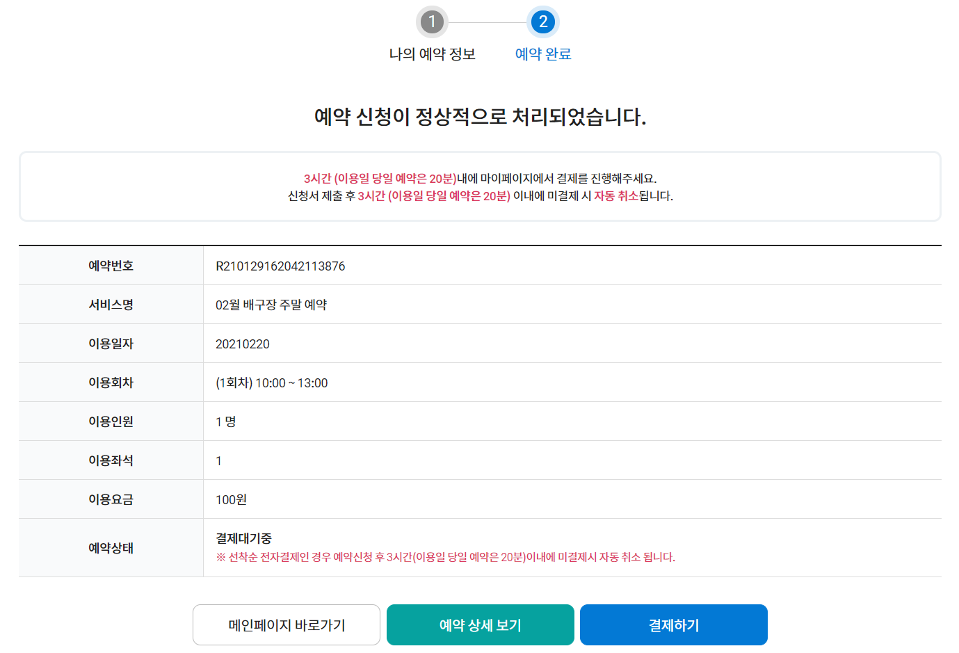 ⑤ 신청자의 예약내용을 숙지한 후 [예약하기] 버튼을 클릭합니다. 서비스가 유료일 경우에는 추가로 결제하는 창이 보이며 결제 후 예약이 완료됩니다.