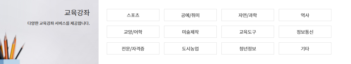 서울시 공공서비스에서 예약할 수 있는 서비스는 크게 체육시설, 공간시설, 문화체험, 교육강좌, 진료복지로 나뉘며 상세한 내용은 홈페이지에서 확인이 가능하며 이미지를 누르시면 상세내용을 보다 크게 확인할 수 있습니다.