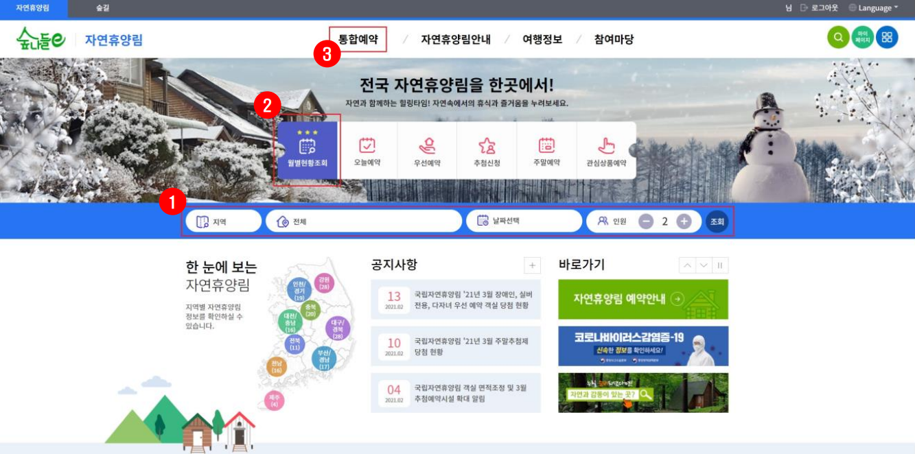 숲나들e는 공식 웹사이트에서 예약을 신청할 수 있으니 먼저 예약 홈페이지로 접속하시길 바랍니다.